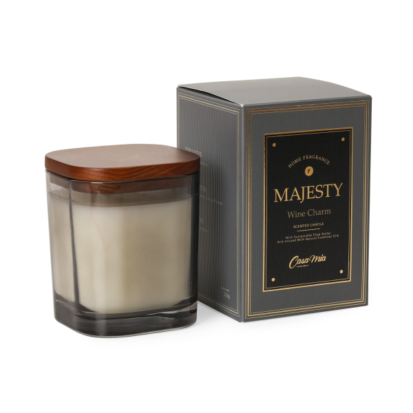 Свічка ароматична Majesty з натуральними ефірними оліями Об'єм воску: 224 г Матеріал: скло, дерево, парафін 1953-10 "Imperial Glory": Верхні ноти: бергамот, яблуко, ананас, шкіряні Серцеві ноти: троянда, жасмин, дим Базові ноти: пачулі, інценс, амбра 1953-08 "Wine Charm": Верхні ноти: м'ята, виноград, полуниця Серцеві ноти: букет, троянда, мед, апельсиновий цвіт Базові ноти: ваніль, ячмінь, корица Примітка: Через високий вміст ароматизаторів в ароматичних свічках на поверхні можуть з'являтися сліди олії – це нормальне явище і воно не впливає на використання