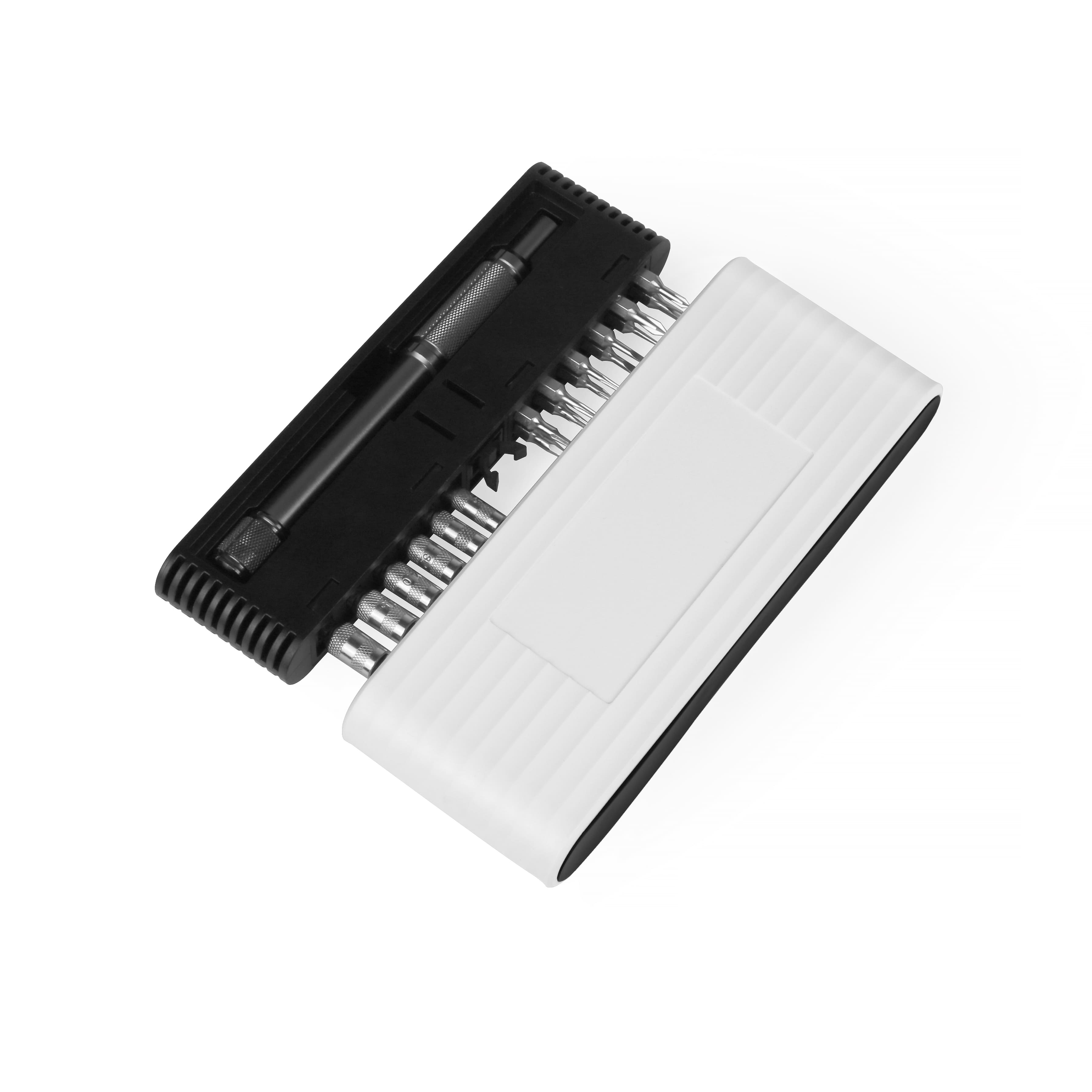 Міні-набір з високоякісної сталі в компактній, пластиковій коробці. В комплект входить 19 шт інструментів: 1шт викрутка 12 шт. Біт (4 x 28 мм): 1.0, 1.5, 2.0, PH000, PH00, PH0, T4, T5, T6, T8, H1.5, H2.0 6 біт для гайок: 2,5 мм, 3,0 мм, 3,5 мм, 4,0 мм, 4,5 мм, 5,0 мм. Розмір набору 13,5 х 5,2 х 2,2 см. Нанесення тамподрук,уф-друк, об'ємна смоляна наліпка .