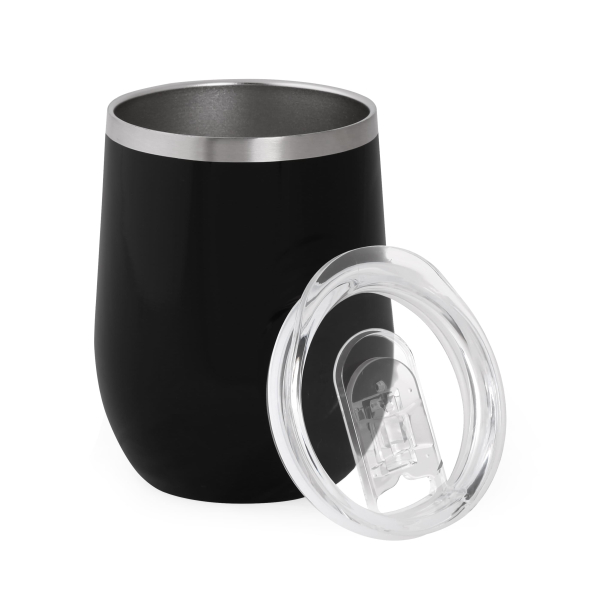 Металева термочашка з подвійними стінками з нержавіючої сталі ( глянцеве покриття емаль) і пластиковою прозорою кришкою з зсувним клапаном. Об'єм 350 мл. Індивідуальна картонна подарункова коробка. Розмір індивідуальної коробки: 12,5 х 9,7 х 9,7 см. Кришку можна мити в посудомийній машині. Корпус мити тільки вручну, щоб не пошкодити кольорове покриття. Підтримує температуру протягом 6-ти годин