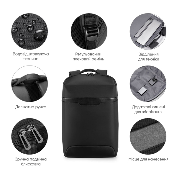 Рюкзак для ноутбука 15,6” та планшету.Тканина водонепроникний 100% поліестер + поліуретан, має основний великий відділ, відділ для ноутбука та планшету, два кармани органайзери, ремінь для валізи. Розмір 46 х 32 х12 см.