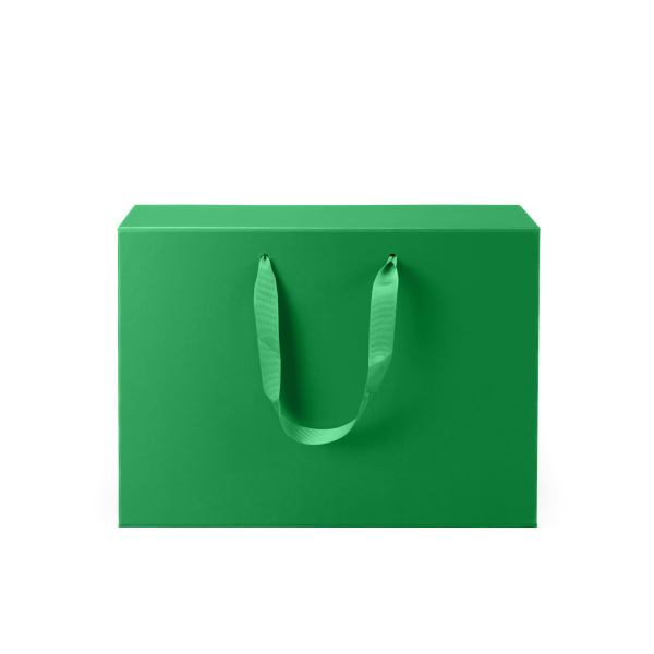 Коробка складна з твердого, переплетеного картону, з двома ручками, вкрита дизайнерським папером. Кришка на магнітах